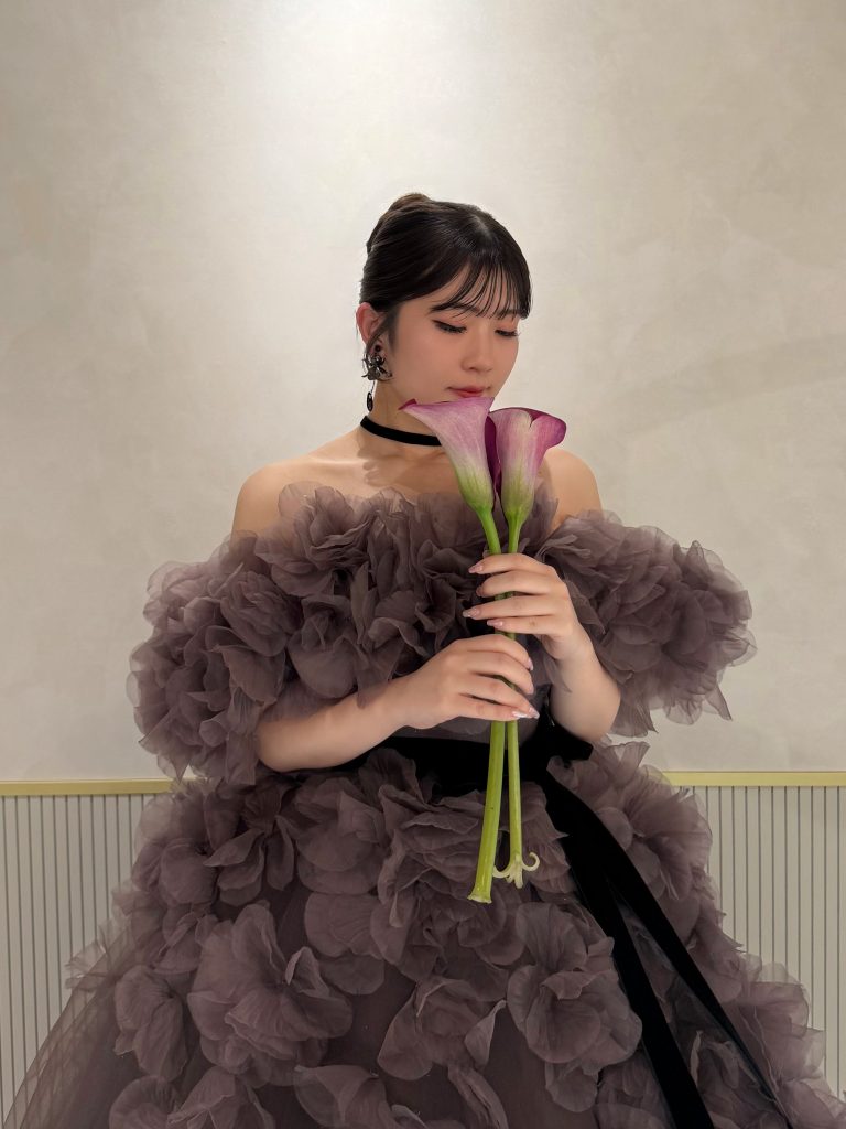 立体のフラワーモチーフが全体にふんわりとした軽やかさを生み出し可憐な印象へ.
