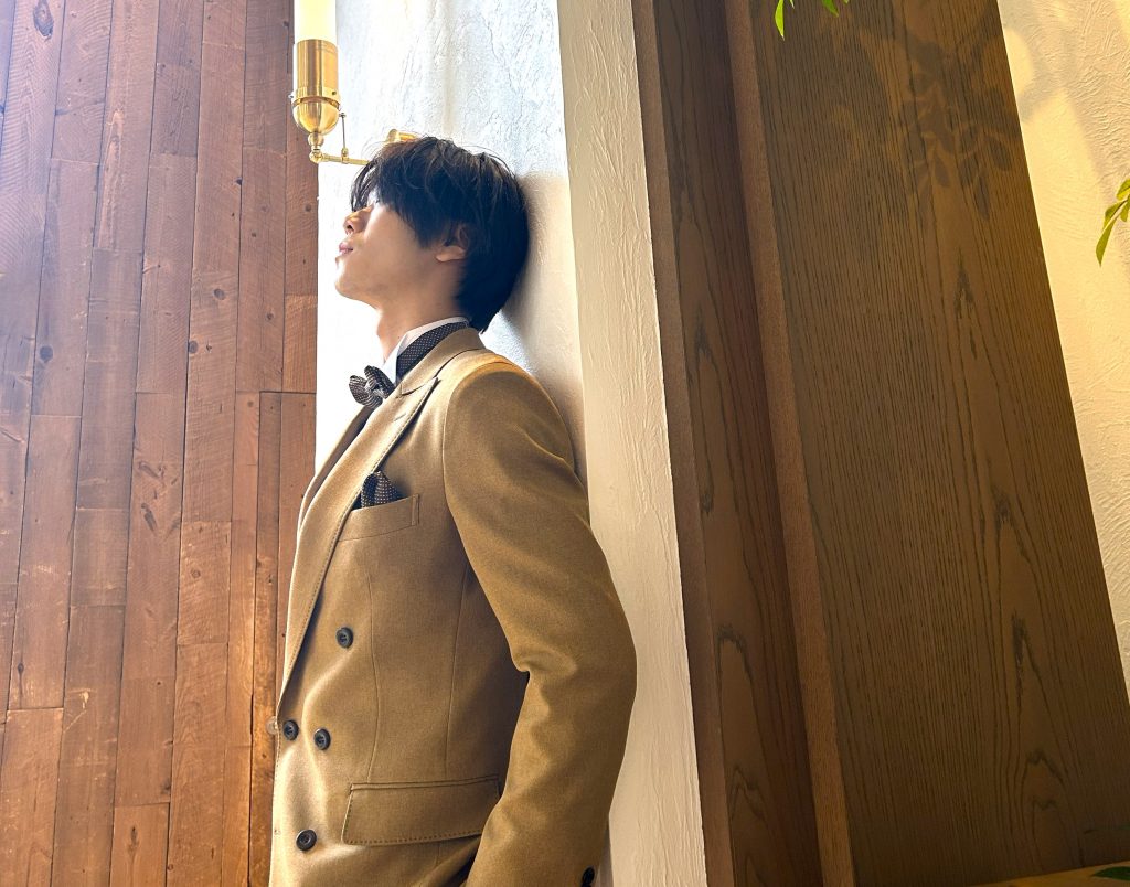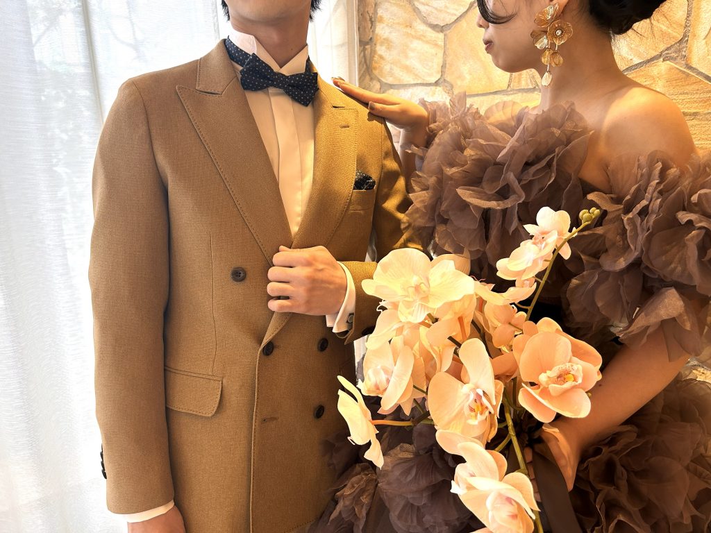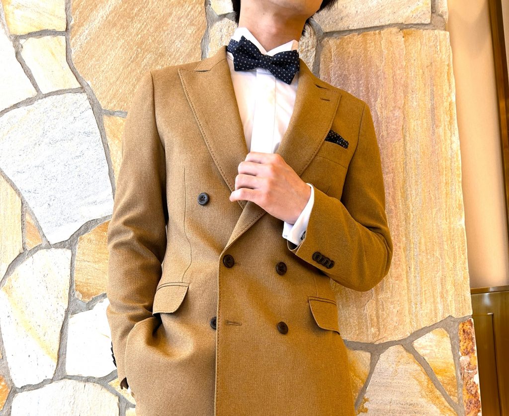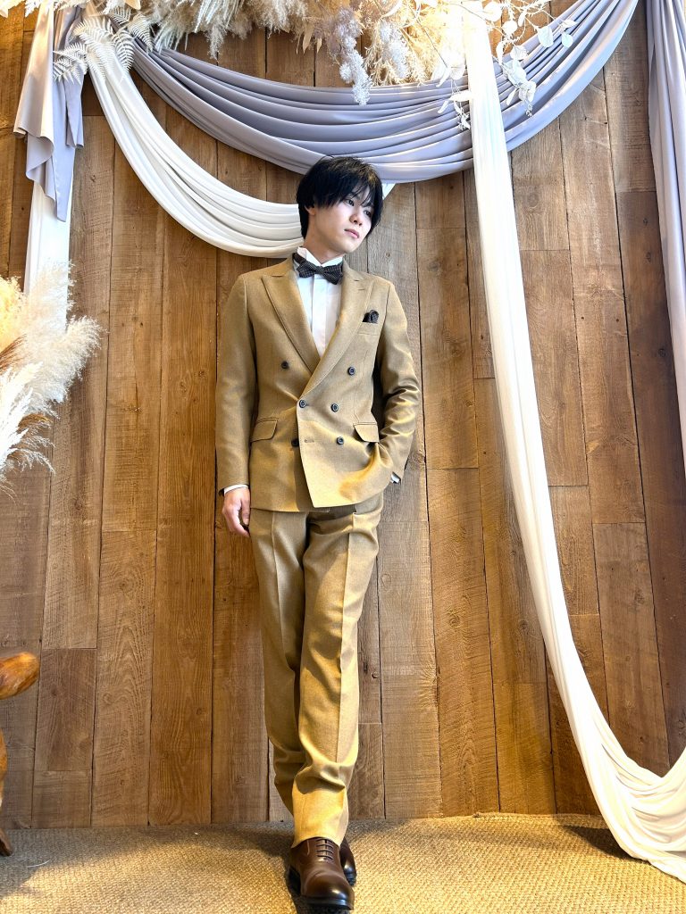 ベージュほど明るすぎず、ブラウンほど重くならないキャメルカラーのタキシード.