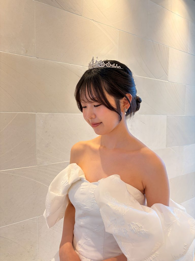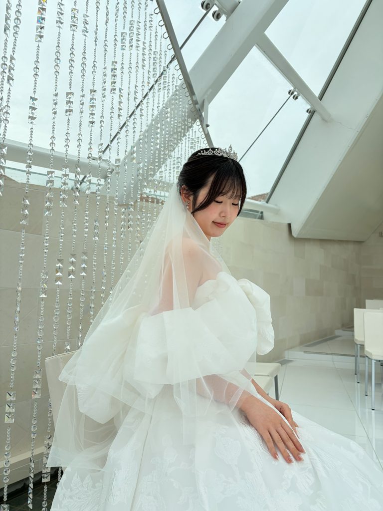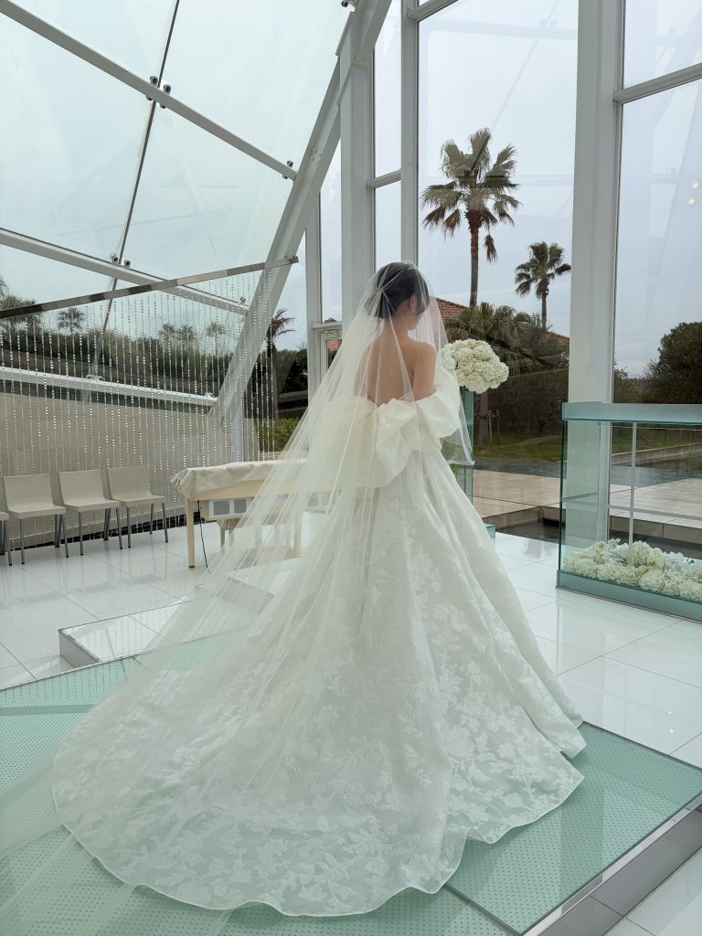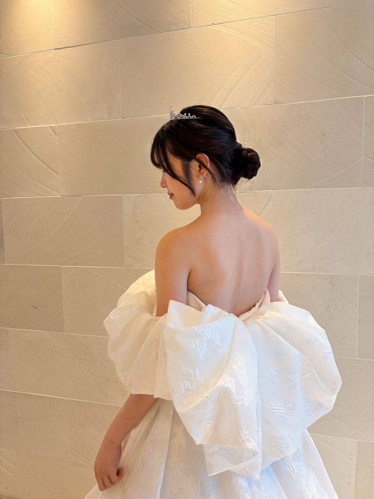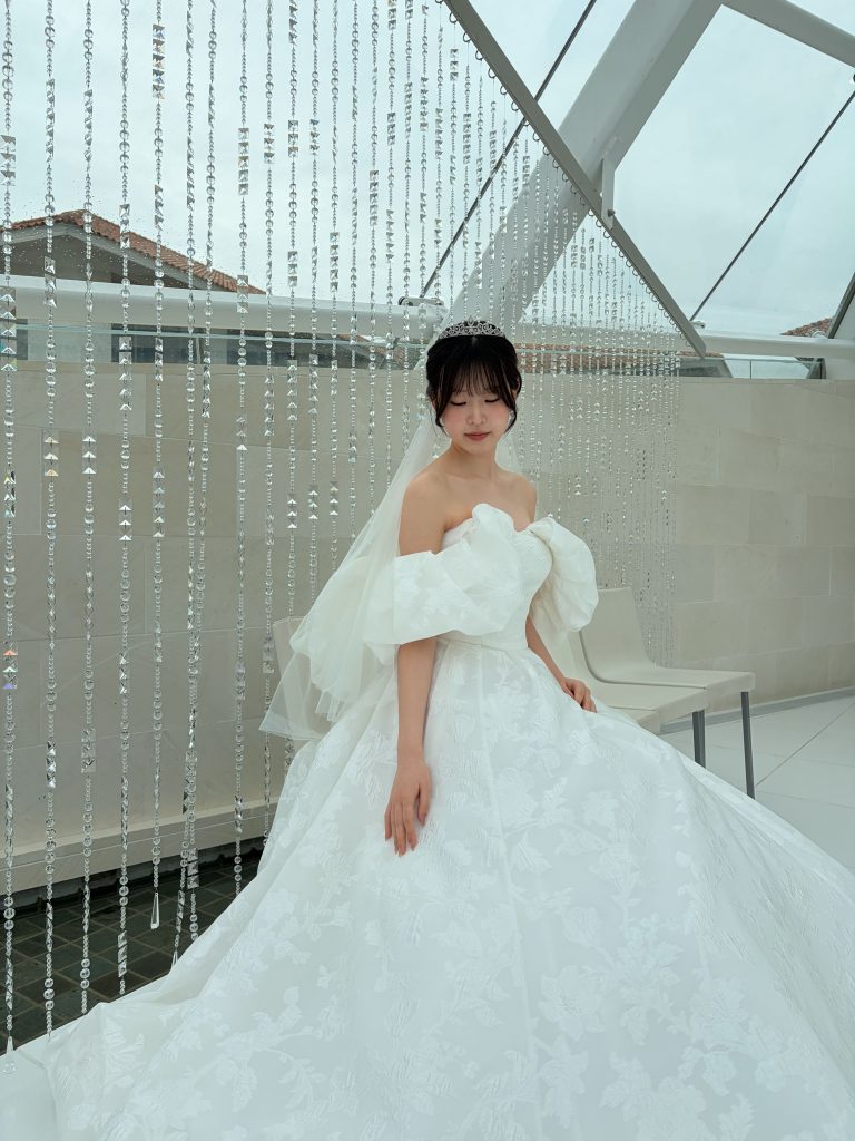 またお洒落なジャガード生地を生かし、シンプルなロングベールと合わせていただくのもおすすめです.