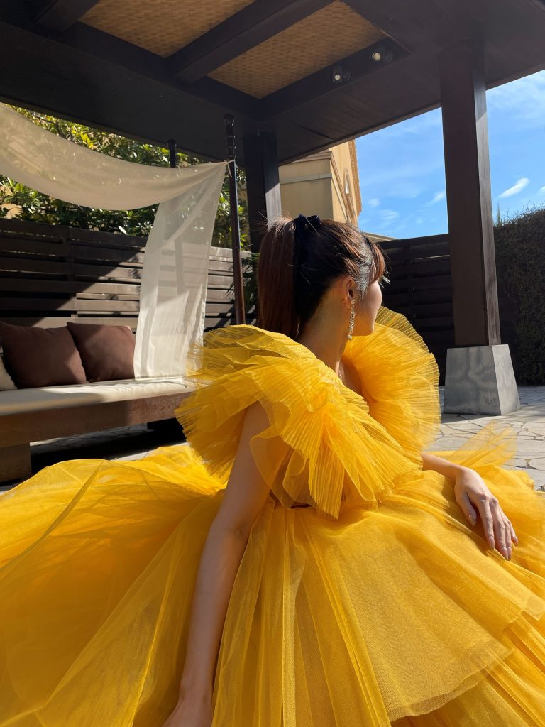 トレンドのプリーツチュールをたっぷりと使用した一着.